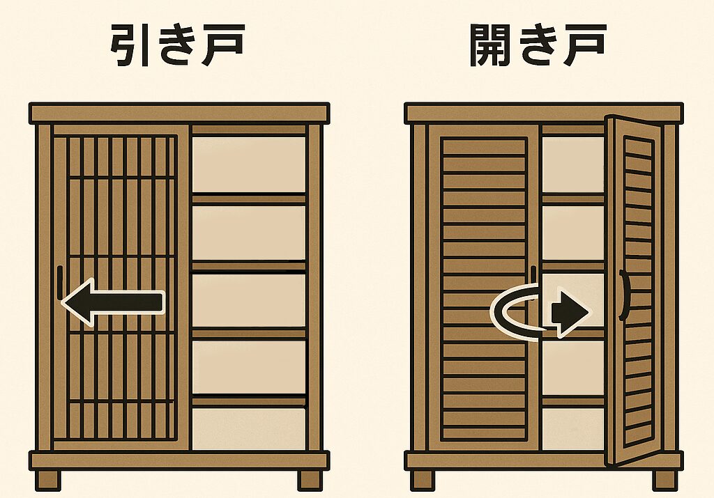 開き戸の場合、扉を開けるたびに前方へ張り出し、空間を圧迫しますが、引き戸なら出し入れの際にも動線が妨げられず、圧迫感がありません。